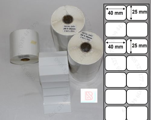 - Cuộn tem 40x25 được bế thành 2 tem/hàng,với kích thước nhãn 40mm x 25mm, cuộn dài 50m (3.570 tem/cuộn), là loại tem rất được phổ biến trong shop quần áo, thời trang, tạp hóa, siêu thị, tem phụ sản phẩm....