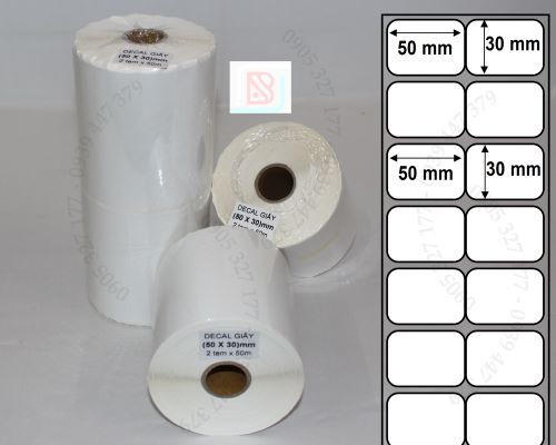 - Cuộn tem 50x30 được bế thành 2 tem/hàng,với kích thước nhãn 50mm x 30mm, cuộn dài 50m (3.000 tem/cuộn), là loại tem rất được phổ biến trong shop quần áo, thời trang, tạp hóa, siêu thị, tem phụ sản phẩm....