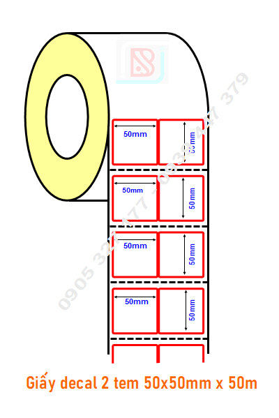 - Cuộn tem 50x50 được bế thành 2 tem/hàng,với kích thước nhãn 50mm x 50mm, cuộn dài 50m (1.880 tem/cuộn), là loại tem rất được phổ biến trong shop quần áo, thời trang, tạp hóa, siêu thị, tem phụ sản phẩm....