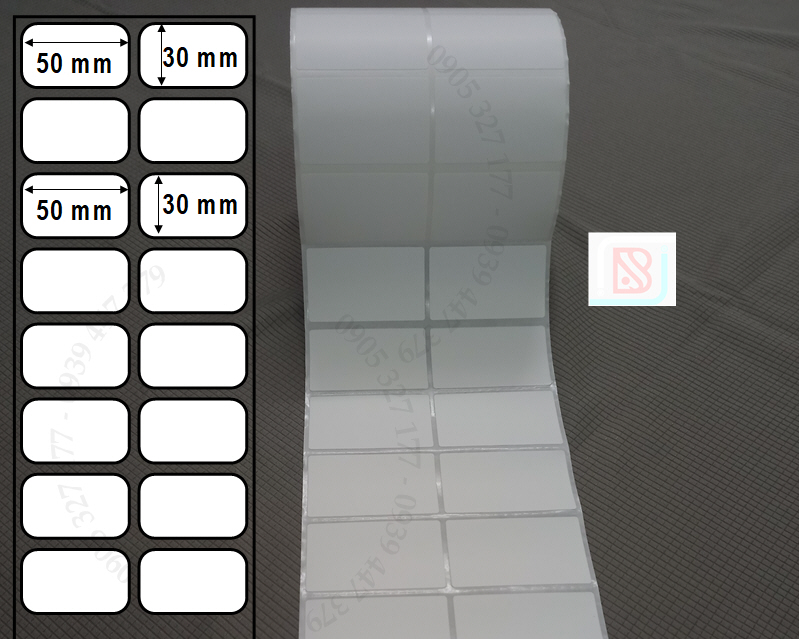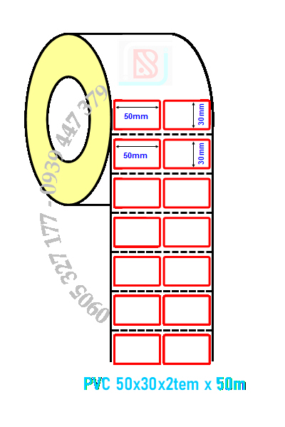 - Cuộn tem nhựa PVC 50x30 được bế thành 2 tem/hàng và có khoảng cách giữa 2 con tem 2mm nên rất dễ lột dán mà không bị dính lẫn với tem còn lại