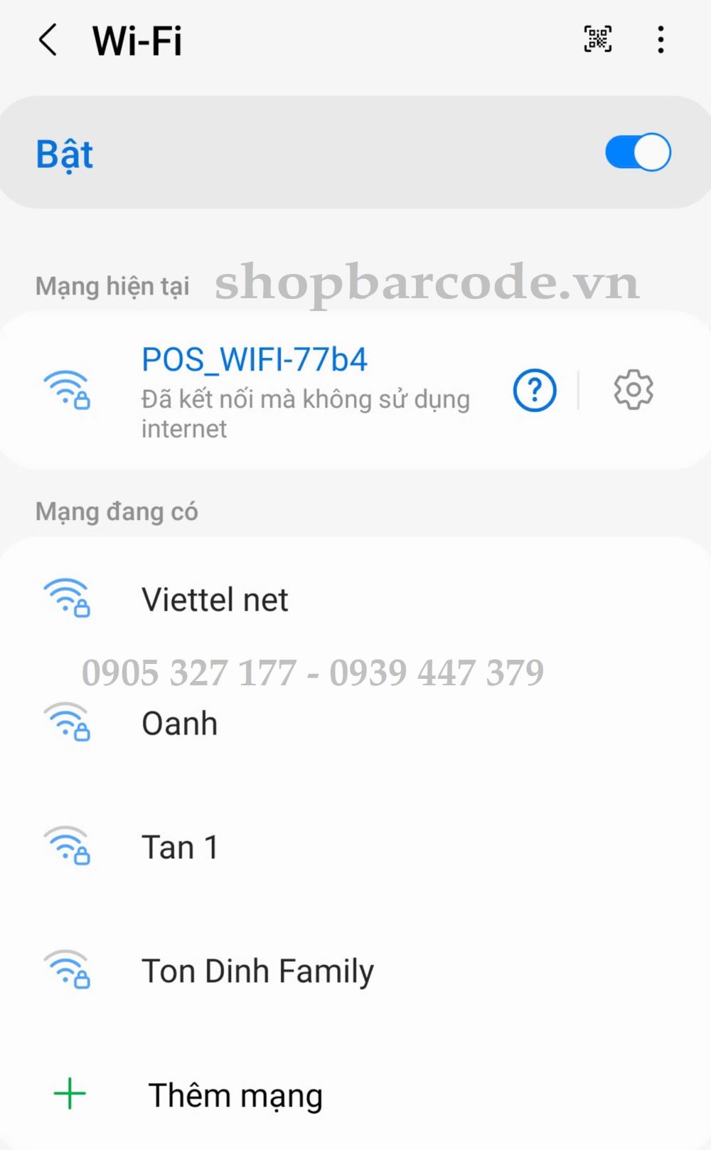 - Mở cài đặt Wi-Fi trên điện thoại của bạn. Tìm đến tín hiệu Wi-Fi có tên như trên bản Self-Test đã in ra. Trong ví dụ này, tên trạm Wi-Fi là: POS_WIFI-77b4