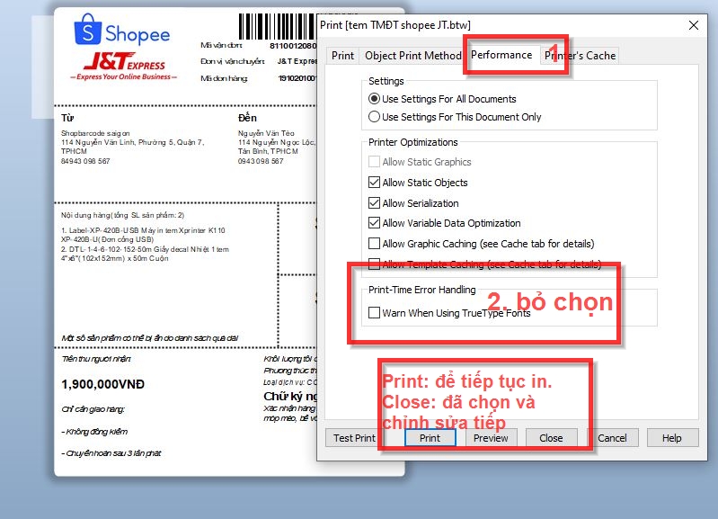 Sau khi thiết kế xong bấm lệnh in như thông thường nhé. Trong bảng thông báo lệnh in chuyển đến Tab Performance (1) --> Bỏ chọn ở mục Warn When Using TrueType Fonts (2): (Gửi cảnh báo khi chọn mẫu chữ mặc định) và tiếp tục chọn Print để in và kiểm tra lại hoặc chọn Close để tiếp tục chỉnh sửa tem (ở đâu phần mềm sẽ hiểu là chúng ta đã chỉnh) và nếu chọn CANCEL là hủy bỏ tất cả những tùy chọn mà mình đã làm trước đó.