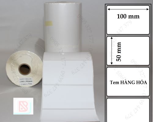 - Cuộn tem 100x50 được bế thành 1 tem/hàng,với kích thước nhãn 100mm x 50mm, cuộn dài 50m (940 tem/cuộn), là loại tem rất được phổ biến trong shop quần áo, thời trang, tạp hóa, siêu thị, tem phụ sản phẩm....