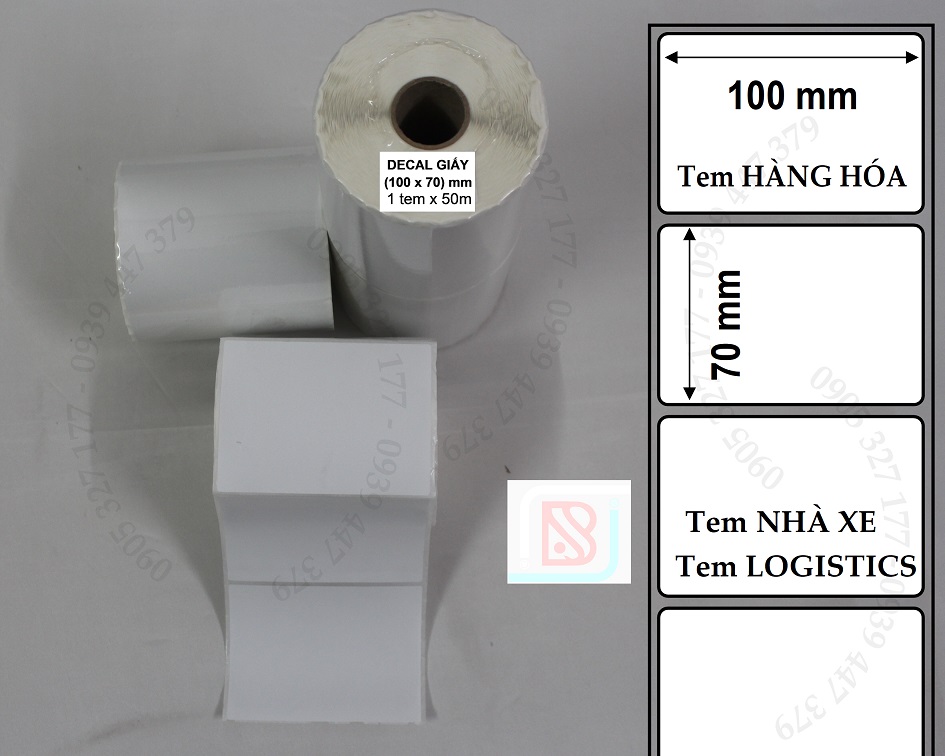 - Cuộn tem 100x70 được bế thành 1 tem/hàng,với kích thước nhãn 100mm x 70mm, cuộn dài 50m (680 tem/cuộn), là loại tem rất được phổ biến trong shop quần áo, thời trang, tạp hóa, siêu thị, tem phụ sản phẩm....