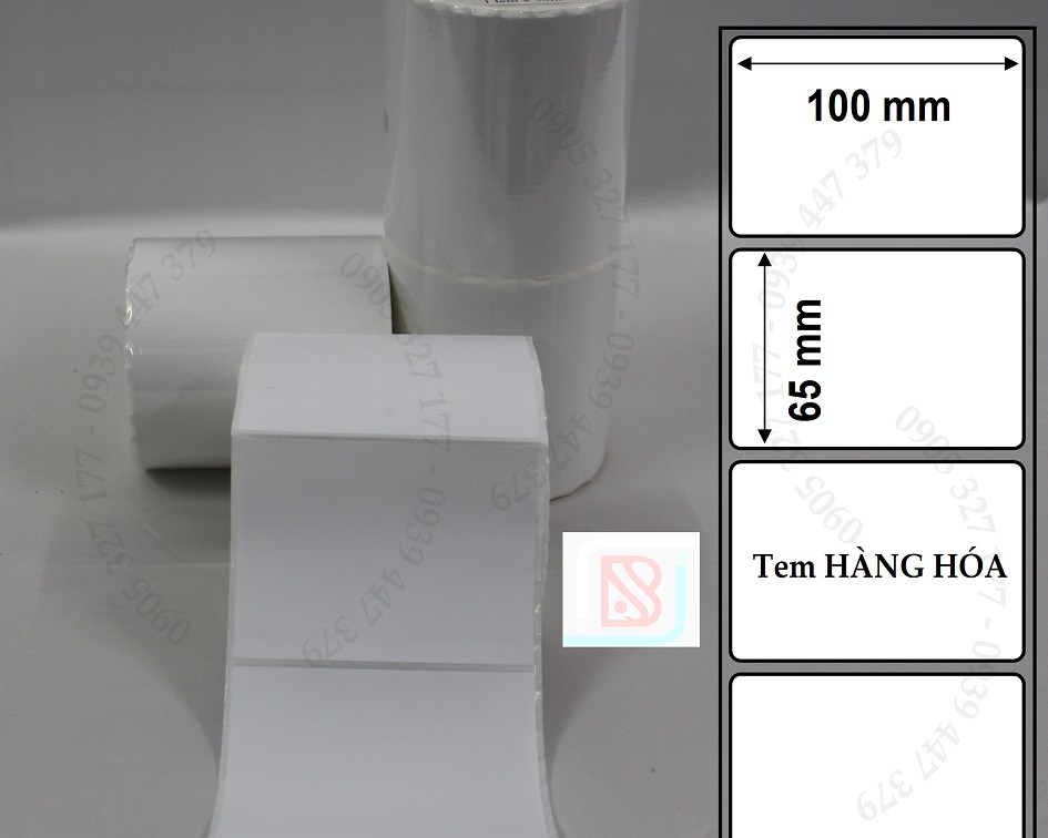 - Cuộn tem 100x65 được bế thành 1 tem/hàng, với kích thước nhãn 100mm x 65mm, cuộn dài 50m (730 tem/cuộn), là loại tem rất được phổ biến trong shop quần áo, thời trang, tạp hóa, siêu thị, tem phụ sản phẩm....