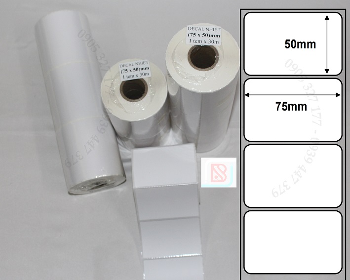 - Cuộn tem nhiệt 75x50 được bế thành 1 tem/hàng,với kích thước nhãn 75mm x 50mm, cuộn dài 30m (566 tem/cuộn), dùng để in tem nhãn mã vạch để dán lên sản phẩm, vật dụng, hàng hóa và rất được phổ biến trong shop quần áo, thời trang, tạp hóa, siêu thị....